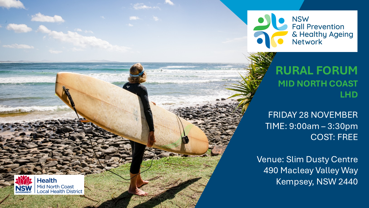 Mark your calendars for the Mid-North Coast LHD Rural Forum. The aim of our rural forums is to inspire local healthcare staff to provide high-quality, evidence-based care with a focus on strategies to reduce risk & harm from falls. The program will include: -